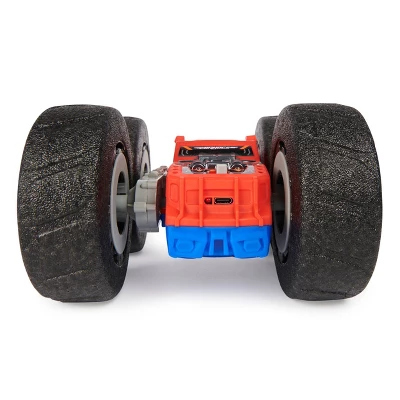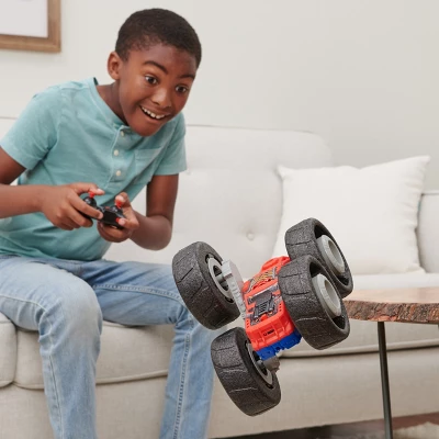 Bring the outdoor play, indoors with Flippin’ Frenzy, the all-new wild RC truck from Air Hogs Super Soft. Spin 360-degrees horizontally or vertically with the exposed arm pivots for maximum fun on your remote control truck. Air Hogs Flippin’ Frenzy puts insane tricks and precision stunt driving in your hands with 2 different colours. Enjoy the red muscle car aesthetic on one side or flip over for a blue sleek sports car look to zip through obstacles with one vehicle. One of their great cool toys to have fun indoors with flips, jumps, and spins without worry thanks to the soft tires. The full-function 2.4GHz remote control allows you to control your RC truck from up to 100 feet range! Easy to control and drive makes it a great toy for ages 4 and up indoors! Have a wild time with the all-new Air Hogs Flippin’ Frenzy.