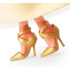 - Her champagne-colored satiny dress features a tulle skirt overlay that shimmers with gold stars.