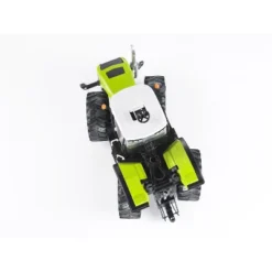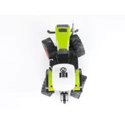 On this Claas Xerion 5000, the cabin windows are made of high quality polycarbonite, the cab can swivel 180 in both directions, and doors can even open. It has a drawbar coupling with a height adjustable hoisting unit. The engine hood and side cover can be opened, and the crab steering is adjustable via a concealed adjusting spindle. The tractor’s wheels are capable of offset driving. There’s also an additional steering rod that allows steering through the sliding roof.