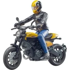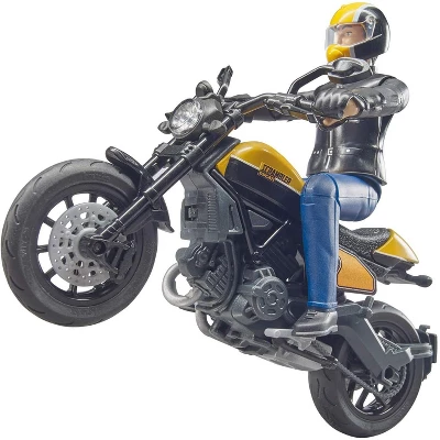 Many people consider motorcycling a pure passion and Ducati manufactures emotions! This is a statement that is reflected in any model made by the Italian motorcycle manufacturer. The Ducati Scrambler Full Throttle is a genuine retrobike in flat track racer style that features typical, detailed elements, such as the seat or the short exhaust. The model has also been equipped with functions, such as the steerable fork or the spring-loaded rear axle. The racer is handled by a bworld figure featuring authentic clothing, matching helmet and gloves. From the comprehensive BRUDER range you can excellently combine it with the RAM 2500 Power Wagon with Scrambler Ducati Desert Sled (item no. 02502) or the bworld motorcycle workshop (item no. 62102
