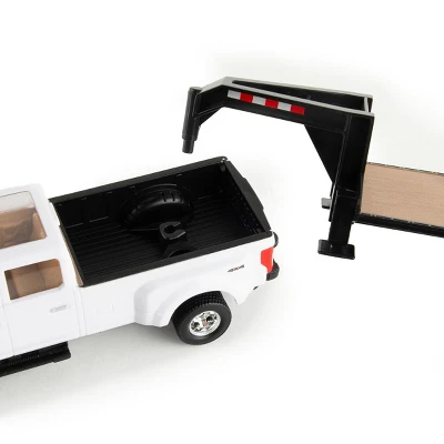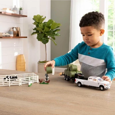 Made by ERTL, this 1/32 scale Ford Round Bale Hauling set is a great addition to any 1/32 play farm. The truck, trailer, and accessories provide a durable realistic looking set that is made for play. The truck featured is a Ford F-350 Lariat with dual rear wheels pulling a deck over trailer with holders for the round bales. The truck and trailer are paired with some farm animals, fencing and hay bales. Per the manufacture the round bale hauling set is suitable for ages 3+ years.