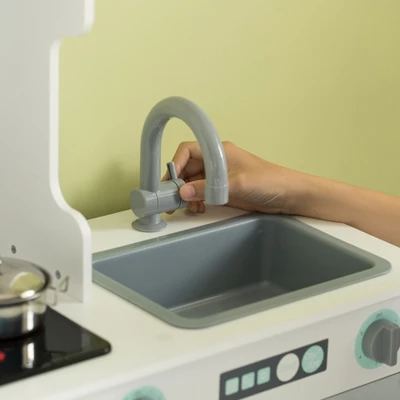 Playtime has never felt so real with the wooden play kitchen. Kids will Discover the excitement of a real working chef as they pretend to prepare food, serve guests, clean house, and organize their supplies just like a grown-up. Our little cook space features all the essential parts of a contemporary kitchen inconvenient compact design. Perfect use for ages 3+.