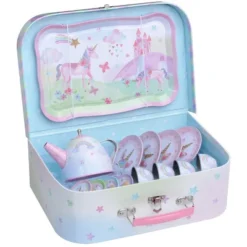 Jewelkeeper’s Tea Time Play set is a perfect gift for kids to encourage their creativity and social skills. This unbreakable tin tea set comes with 15 pieces, including a teapot, cups, saucers, plates, and a carrying case with a metal handle for easy transport and storage. The set is 100% BPA and lead free, and can be easily cleaned with a damp cloth. It is not suitable for children under 3 years old.