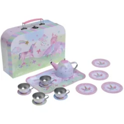 Jewelkeeper’s Tea Time Play set is a perfect gift for kids to encourage their creativity and social skills. This unbreakable tin tea set comes with 15 pieces, including a teapot, cups, saucers, plates, and a carrying case with a metal handle for easy transport and storage. The set is 100% BPA and lead free, and can be easily cleaned with a damp cloth. It is not suitable for children under 3 years old.