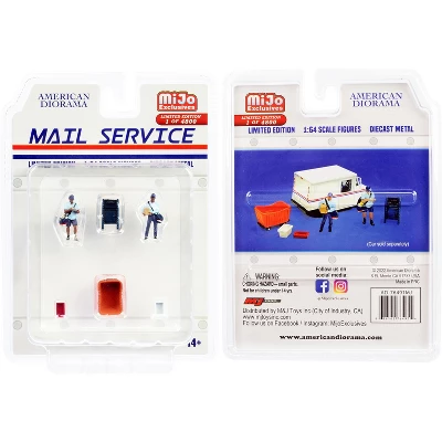 Brand new 1/64 scale diecast models of “Mail Service” 6 piece Diecast Set (2 Male Mail Carrier Figurines and 4 Accessories) Limited Edition to 4800 pieces Worldwide 1/64 scale models by American Diorama.Brand new box.True-to-scale detail.Made of die-cast metal.Comes in a blister pack.Does not come with truck shown.Each figurine is approximately 1 inch tall.Manufacturer’s original unopened packaging.Only 2 figurines and 4 accessories will be received.