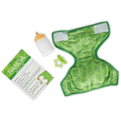 - Includes removable pacifier, baby bottle that fits in animal’s mouth, removable cloth diaper, double-sided activity card