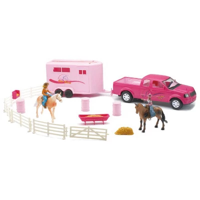This is a 1/25 pink truck and trailer set with horses and accessories, by New Ray. This set is perfect for any little rodeo fan or ranch hand! The set features a pickup truck, a trailer, horses, barrels, saddles, riding figures, and more! When hooked together, the truck and trailer measure approximately 21.75″L x 4.5″W x 4.75″H. This set is recommended for ages 5+ years.