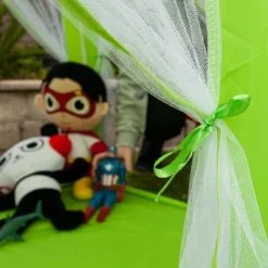 - DURABLE CONSTRUCTION: High quality polyester. Mesh doors with rope ties on each side for spacious play.