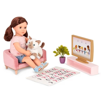 Design a stylish space for your doll friends to gather and play with the Our Generation Lovely Living Room set! Perfect for dollhouses or on its own, each movable piece can be arranged and rearranged to create fresh styles. The doll-sized couch comfortably fits an 18-inch doll and their pet side by side, and the television stand has a storage space to display small accessories. Additional decor items like the area rug, heart-shaped pillow, television, and house plant let interior designers add the finishing touches as they personalize their living room. This complete living room furniture set is compatible with most 18-inch dolls and accessories. Dolls and pets sold separately.