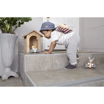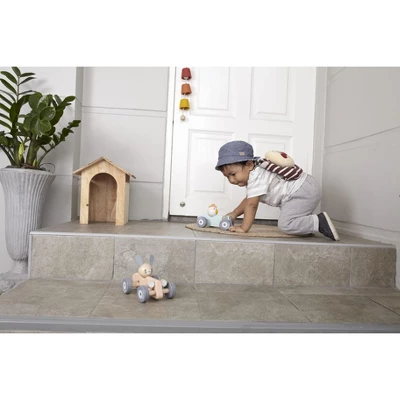 Prepare for the big race with the PlanToys Bunny Racing Car! This vintage-themed race car stands out amongst the rest with its bright, old-school design. Rev your engine and develop fine motor skills, hand-eye coordination, concentration ability and communication skills! Suitable for children ages 12 months and older. Sustainably made in Thailand using chemical-free rubberwood, non-formaldehyde glue, organic pigments and water-based dyes.