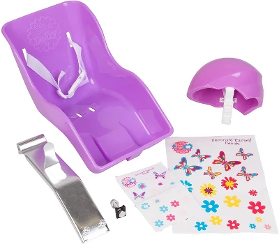 18 inch doll purple bike seat and doll helmet with DIY decorative decals. Easily attaches to the rear crossbar hole of most bikes. The perfect warm weather activity for your daughter or son – just strap in your favorite doll or stuffed animal and take them on a bike ride with you. Don’t forgot to strap a helmet on them for safety!