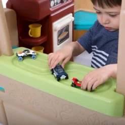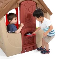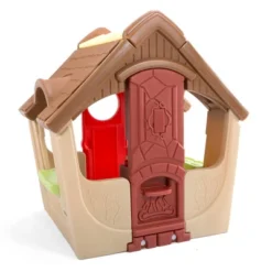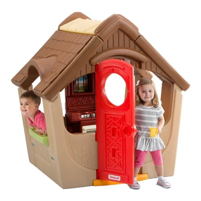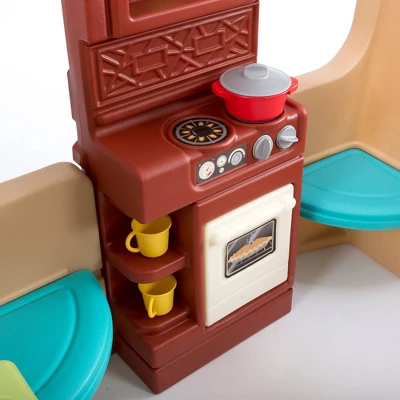 Parents appreciate the appealing design, rich detailing and an open airy style for a full view of playtime happenings. The interior features an inviting fireplace and four corner seats for friends to share in the fun. A kitchenette with a sink, oven, clicking knobs and molded-in shelves as well as an exterior chimney with pretend pizza oven offers more cooking fun. Two window sills offer a place to serve up culinary creations or use the molded-in track to drive their favorite mini vehicles.
