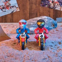 Race like the pros with the all-new, Supercross Race and Wheelie Competition Set! Includes Ricky Carmichael and Ken Roczen bikes with riders and a deluxe ramp! With rev-up performance, tilt the rider’s helmet forward for straight line speed or backwards to pop into an epic wheelie. Race head-to-head and recreate the action of live Supercross events with your own Official Supercross dirt bike toys!