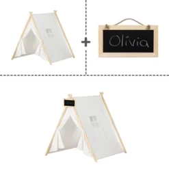 This little play tent comes with a cute little chalkboard for your kid’s name, a camp name, or a “No grown-ups!” warning. You can write on it with chalk and wipe it off with a small wet cloth.