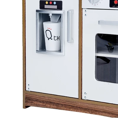 Give your little ones a kitchen of their own with the Teamson Kids Little Chef Palm Springs Classic Kids Play Kitchen with 6 Accessories. This retro-style play kitchen is designed with a natural wood finish and white accents, making it great for both boys and girls, and it completes any home, classroom, preschool, or daycare playroom. The functional and interactive design features openable oven doors, a refrigerator, 2 turning oven knobs, 2 induction burners that make realistic cooking noises and glow red, an ice maker, a sink, and an under-sink cabinet to enhance your little one’s play time. With 10 included accessories – a pan, pot, 2 spatulas, 2 spice bottles, 3 plastic ice cube, and a cup included– this toddler kitchen encourages role play and lights up your little chef’s imagination and creativity. The durable and eco-friendly construction is kid-safe and easy to wipe clean with a damp cloth for every day messes. The easy-to-follow instructions allow for quick adult assembly so play time can start right away. This kid-sized toy kitchen has a compact size and is recommended for children ages 3 years and up. Induction cooker requires 2 1.5V AA/LR6 batteries (not included).