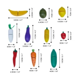 - PRETEND FOOD: Includes a 2-piece eggplant, 2-piece pepper, 2-piece carrot, 2-piece corn, 2-piece radish, 2-piece cucumber, 2-piece banana, 2-piece strawberry, 2-piece lemon, and 2-piece kiwi